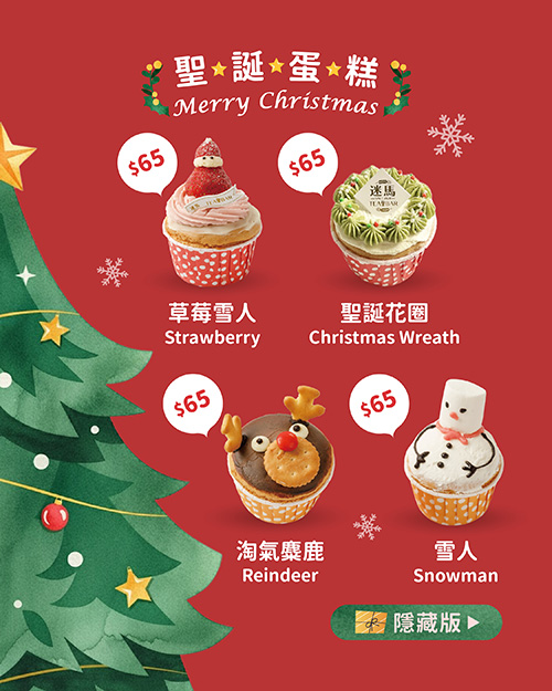迷馬杯子蛋糕準備好陪你一起過聖誕啦!可愛造型的杯子蛋糕 添加益生菌擠花使用馬茲卡邦乳酪取代鮮奶油清爽不甜膩 熱量不超標天然梔子花色粉調色吃得安心又美味這個聖誕節,用甜點說出你最想說的心意吧願這份甜,陪你度過最浪漫、最暖心的聖誕夜聖誕節限定款|內餡口味• 雪人|藍莓卡士達 $65• 淘氣麋鹿|巧克力(可更換鮮豆奶)$65• 聖誕花圈|鮮豆奶 $65• 草莓雪人|草莓 $65• 隱藏版・聖誕老公公|草莓 $75