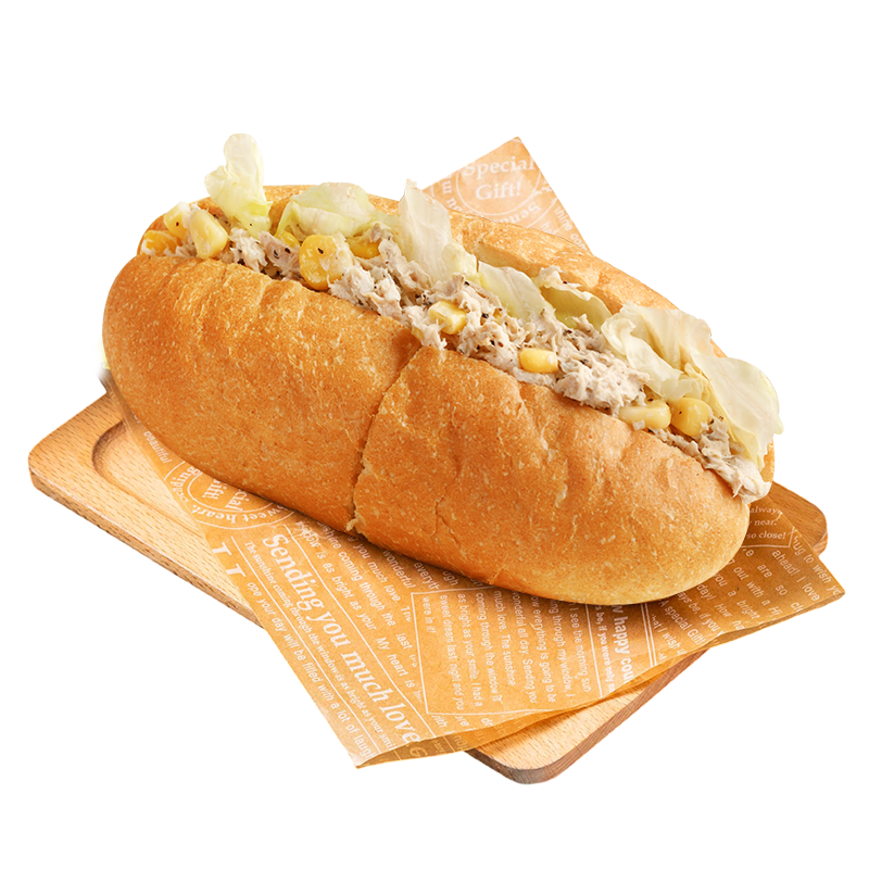 鮪魚與玉米拌入洋蔥丁,清爽又帶點脆感,搭配生菜一起夾入鹹香餐包,層次更豐富,一口接一口停不下來!